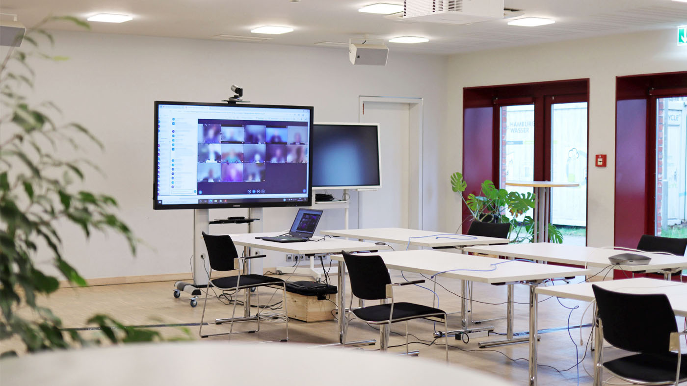 Seit Januar 2021 können Tagungsgäste bei uns hybride Meetings und Seminare durchführen. Dafür haben wir unsere audiovisuelle Technik so erweitert, dass entfernte Teilnehmende nicht nur passiv zuschauen und -hören können, sondern echte Mitmachmöglichkeiten haben, indem sie über einen großen Bildschirm gut sichtbar und über eine Freisprechanlage gut hörbar sind. Mit unseren Kooperationspartnern wie der Stadtreinigung Hamburg und Weiterbildung Ernährung haben wir bereits erste hybride Pilotveranstaltungen erfolgreich umgesetzt.