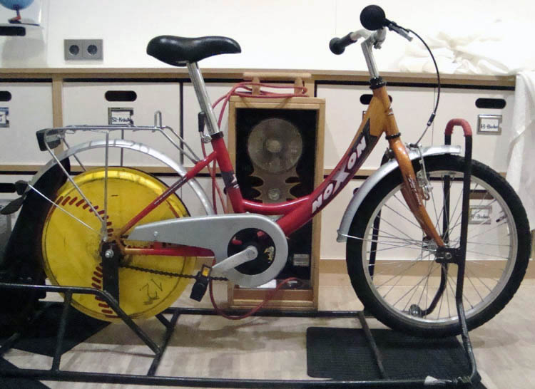 Wie entsteht eigentlich Energie? Woher kommt sie und wie aufwendig ist es, Strom zu produzieren? Das Energie-Erlebnis-Fahrrad eignet sich hervorragend, um Kindern aus Kindergärten und Vorschulen zu vermitteln, was sich hinter dem Begriff „Energie“ verbirgt. So können sie erleben, welche Muskelkraft nötig ist, um eine Lampe zum Leuchten (und einen Kassettenrecorder zum Spielen zu bringen) oder wie lange sie strampeln müssen, um ein Glas Wasser mit einem Tauchsieder zu erwärmen.