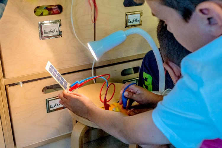 Die Schüler*innen – lernen die Grundlagen naturwissenschaftlichen Arbeitens kennen (Hypothesenbildung, Beobachtung, Protokollieren). / – üben eigenverantwortliches Experimentieren. / – praktizieren den Umgang mit verschiedenen Materialien, Geräten und Messinstrumenten. / – präsentieren ihre Ergebnisse der Klasse. / – haben die Möglichkeit, sich eigene Versuche auszudenken. – arbeiten mit Solarzellen. / – probieren einen Solarkocher aus. / – experimentieren mit Wasserkraft. / – erzeugen Strom mit einem Energiefahrrad. / – messen und vergleichen den Stromverbrauch unterschiedlicher Glühbirnen und des Föhns. / – erfahren die Umwandlung von Energie anhand fallender und rollender Murmeln. / – weisen die Energieträger Fett und Stärke in Lebensmitteln nach.