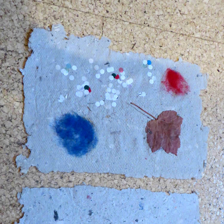 Wir schöpfen Papier aus Altpapier-Faserbrei und arbeiten kreativ Farbe und Pflanzenteile ein.