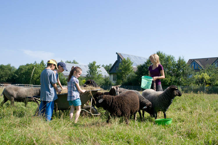 Hier erfährt man alles Wissenswerte rund um die rauwolligen Pommerschen Landschafe und die Ziegen auf Gut Karlshöhe. Was fressen Schafe? Wie alt können sie werden? Wieviele Mägen haben sie? Was passiert mit der Wolle? Alle Fragen werden sachkundig beantwortet. Die Kinder dürfen bei der Versorgung der Tiere und der Fütterung im Stall und auf der Weide mithelfen. Im Anschluss wird ein Werkstück aus gefilzter Schafwolle zum Mitnehmen hergestellt.