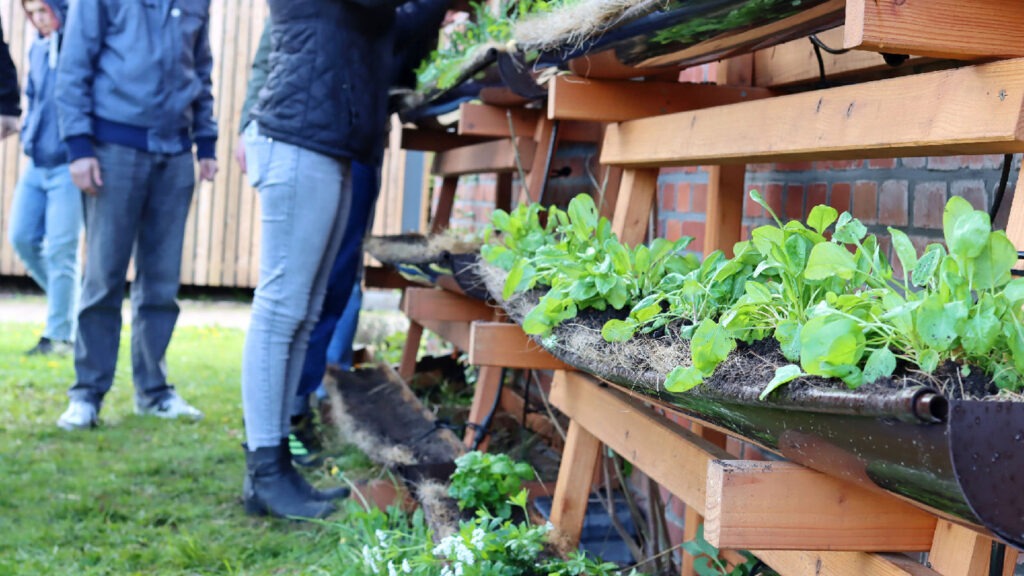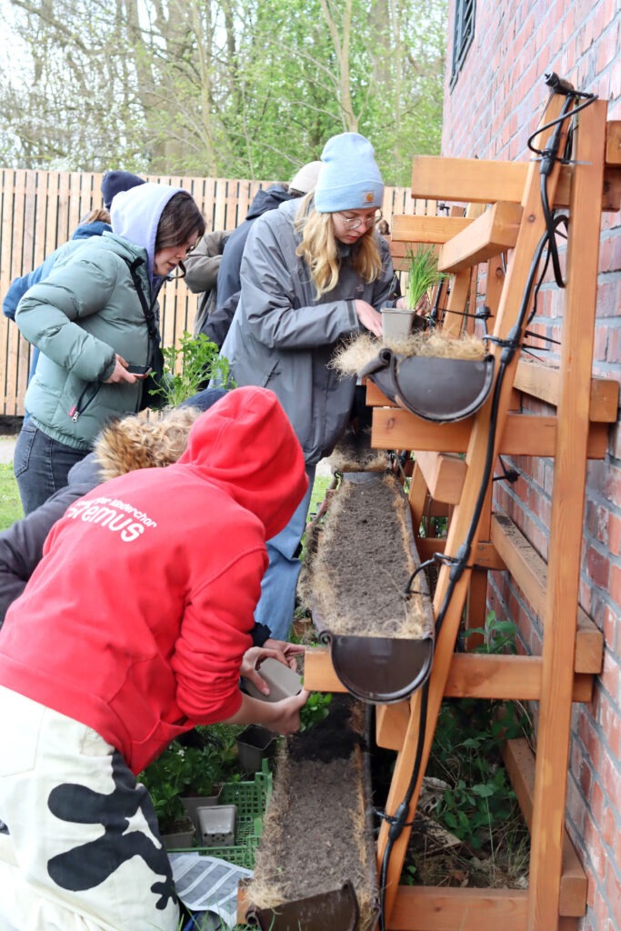 Im April 2023 wurde die Vertical Farm im Rahmen eines Workshops mit FÖJler*innen neu bepflanzt. Besonders geeignet für diese Station sind Salate, Spinat, Radieschen, Walderdbeeren, Schnittlauch und Petersilie, Sauerampfer, Waldmeister und Zitronenmelisse, da sie nicht zu starkwüchsig sind und Halbschatten vertragen. Den Anbauplan stellen wir als PDF-Download zur Verfügung.